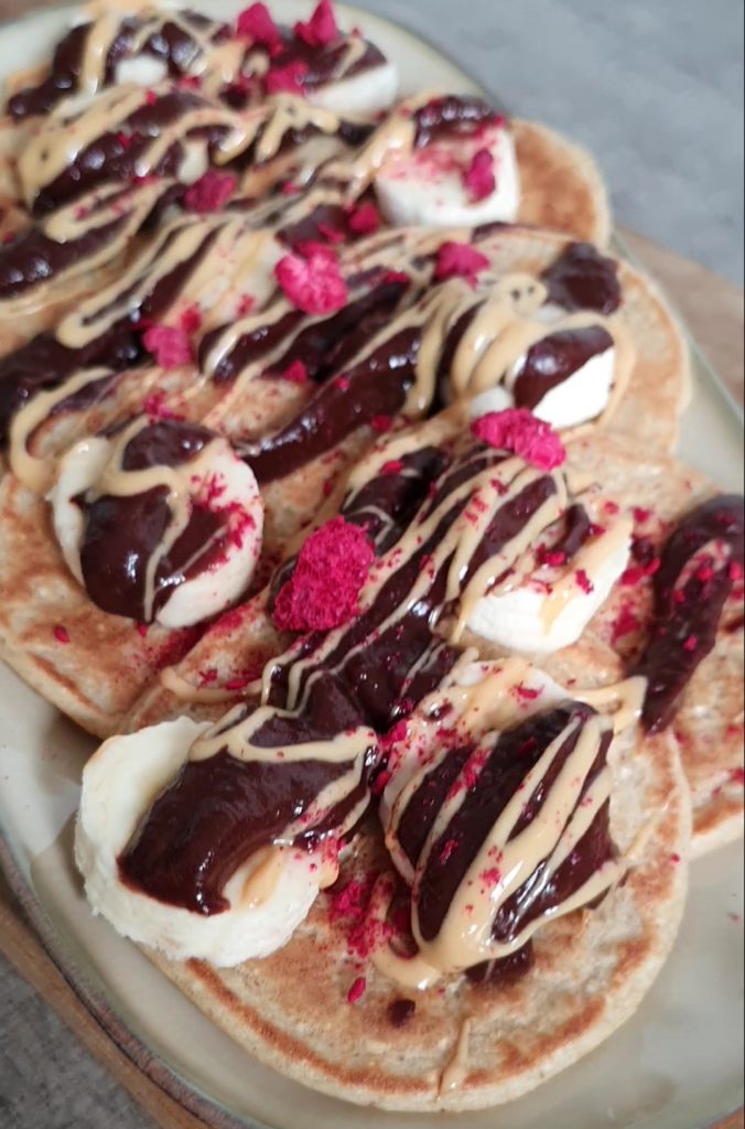 ▶️ Ich toppe die Pancakes am liebsten mit Banane und Nussmus.
